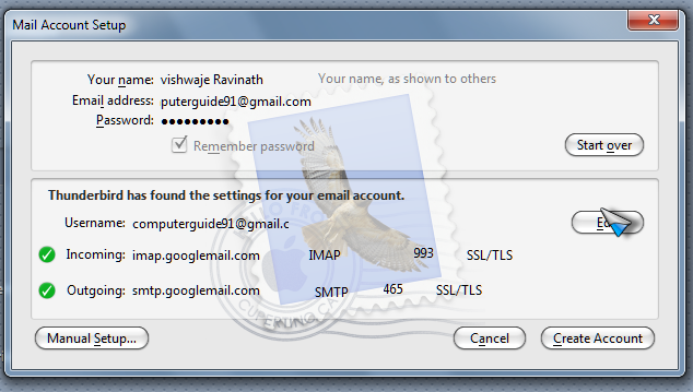 6. ඉන්පසු Create Account බෙත්තම එබීමෙන් ඊමේල් ගිණුම සථාපිත කරගත හැකිය. ඔබට තවදුරටත් යම්කිසි සකස් කිරීමක් කිරීමට අවශ්යනම් (උ. දා. ඊමේල් සොයාබලන කාල පරතරය ආදිය...) Manual Setup බෙත්තම එබීමෙන් සංකීර්ණ වින්ඩෝව දිස්වේ. මෙහි ඇති බොහෝ සකස් කරීම් සංකීර්ණ පරිශීලකයන් සඳහා වන බැවින් ඉතා හොඳින් කියවා බලා එවා සකස් කරන්න. යම් කිසි වැරැද්දක් සිදුවී එය සකස් කරිමට නොතේරේ නම් එම ගිණුම මකාදමා මුළ සිට පටන්ගන්න.