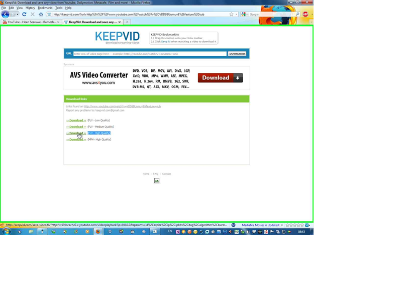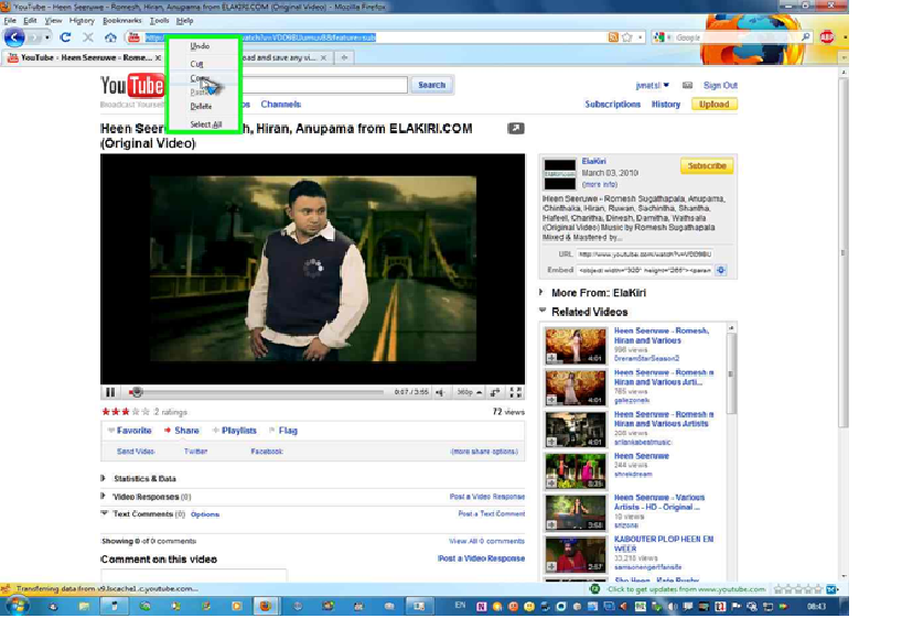 1. මුලින්ම ඔබට අවශ්ය වීඩියෝ එක තෝරාගන්න. එවිට එය ධාවනය (Play) වීමට පටන්ගනු ඇත. එවිට ඔබගේ බ්රවුසරයේ (E.g. Internet Explorer, Firefox, Chrome, Safari, Opera etc.) වෙබ් ලිපිනය අඩංගු තීරයේ (Address Bar) අඩංගු වෙබ් ලිපිනය සම්පූර්ණයෙන්ම තෝරා (select) කොපිකර ගන්න. (Right click -> copy)